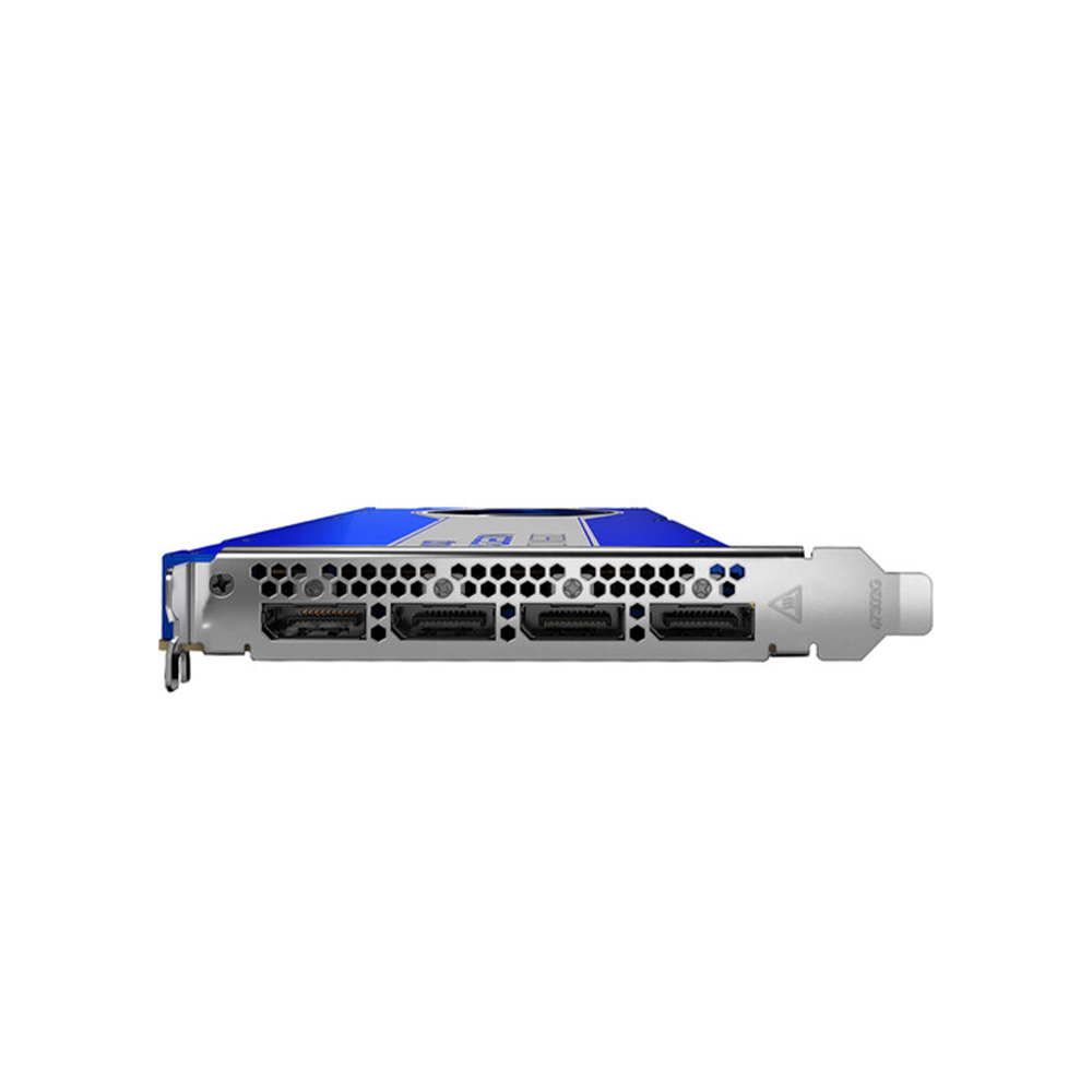 The front panel of the card features four DisplayPort 1.4 outputs. This graphics card support AMD Eyefinity technology for multi-display support. To keep this card cool, AMD implemented a blower-style cooler. By using a radial fan, this system forces air over the components and exhausts it out through the front of the card. This compact cooling solution is ideal for configurations involving tight spacing between components, crucial in smaller enclosures.