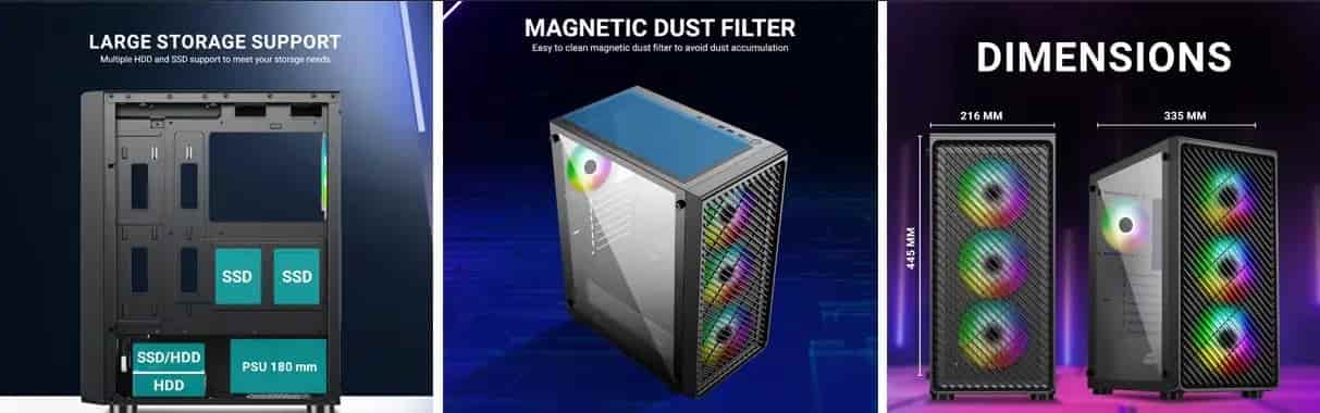 The Ant Esports 211 Air gaming cabinet is your ultimate choice for a superior gaming experience. This powerhouse of a cabinet comes pre-loaded with not just one, but four dazzling 120mm ARGB fans, providing both exceptional cooling and an eye-catching display of RGB brilliance. But that’s not all – with support for up to six 120mm fans in total, you have the flexibility to fine-tune your cooling setup to meet your exacting demands.Storage options are abundant in the Ant Esports 211 Air. Whether you prefer the reliability of HDDs or the speed of SSDs, this cabinet has you covered, accommodating up to two HDDs and two SSDs, or three SSDs and one HDD, ensuring you never run out of space for your gaming library.