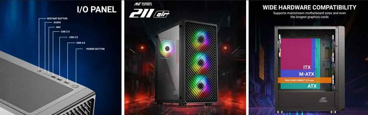 - Motherboard Compatibility: The Ant Esports 211 Air is ready for a variety of gaming setups, supporting up to ATX motherboards. Whether you’re building a powerful gaming rig or a versatile workstation, this case has the space and compatibility you need.