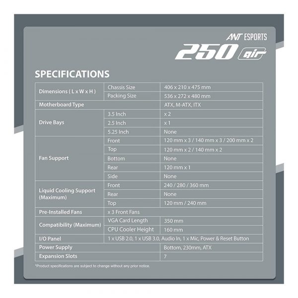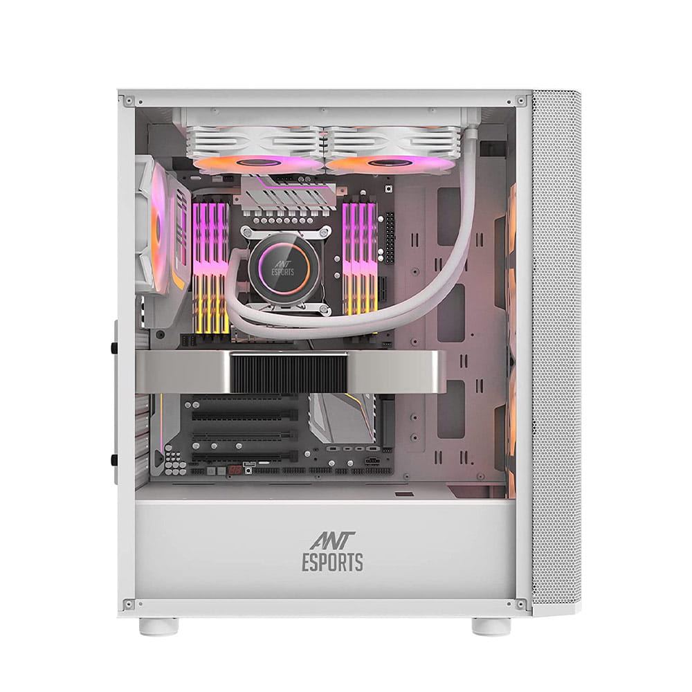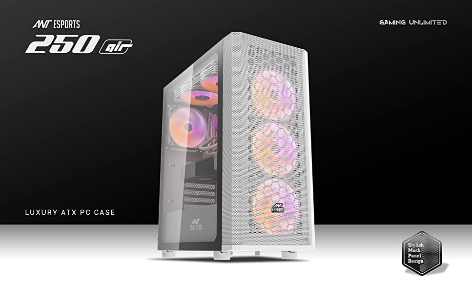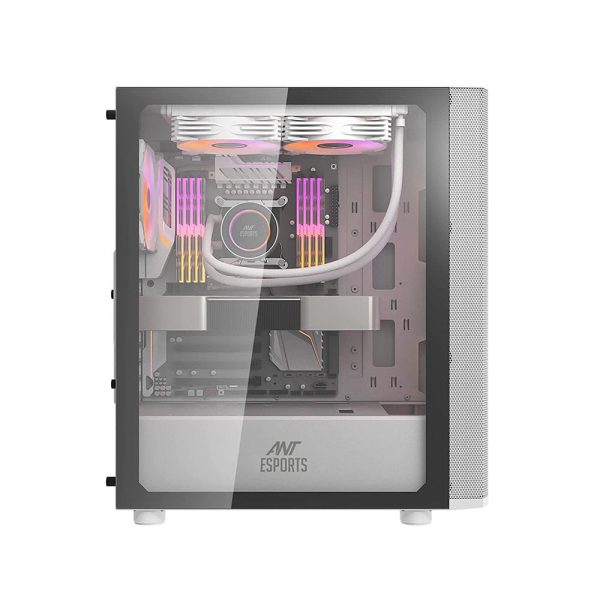 Three 120mm A-RGB fans come pre-installed out of the box and with support for upto six fans in total the Ant Esports 250 Air White is ideal for high TDP builds. In terms of radiator support the case offer a 360mm mount in the front and upto a 280mm on top along with 160mm of clearance of CPU air coolers to keep even the most demanding systems cool under heavy load.