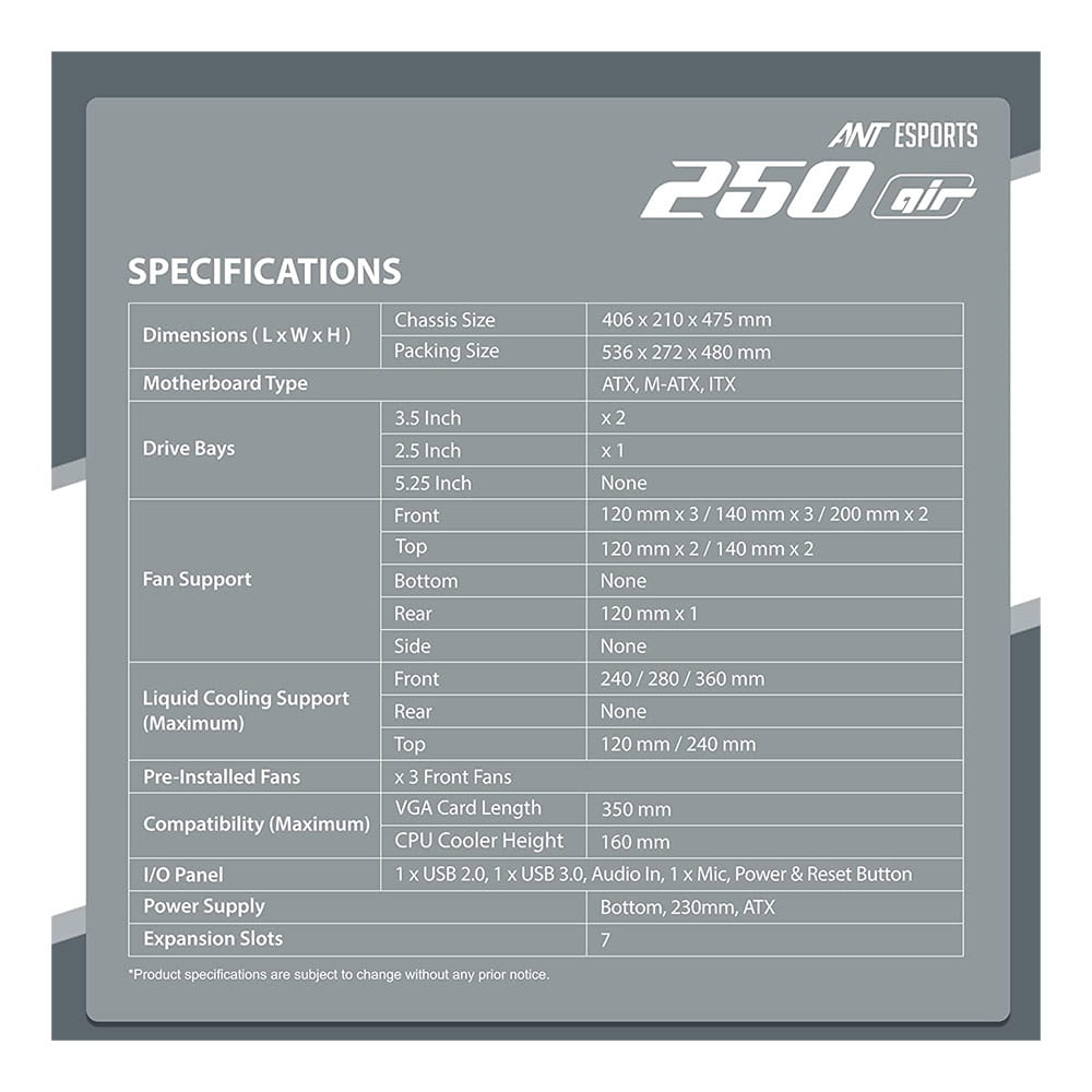 The Ant Esports 250 Air White is a distinctive, yet minimalist, mid-tower ATX case with easy cable management and exceptional cooling. A highly durable solid steel front panel etched with stylish air flow vents deliver high air flow along with great looks.