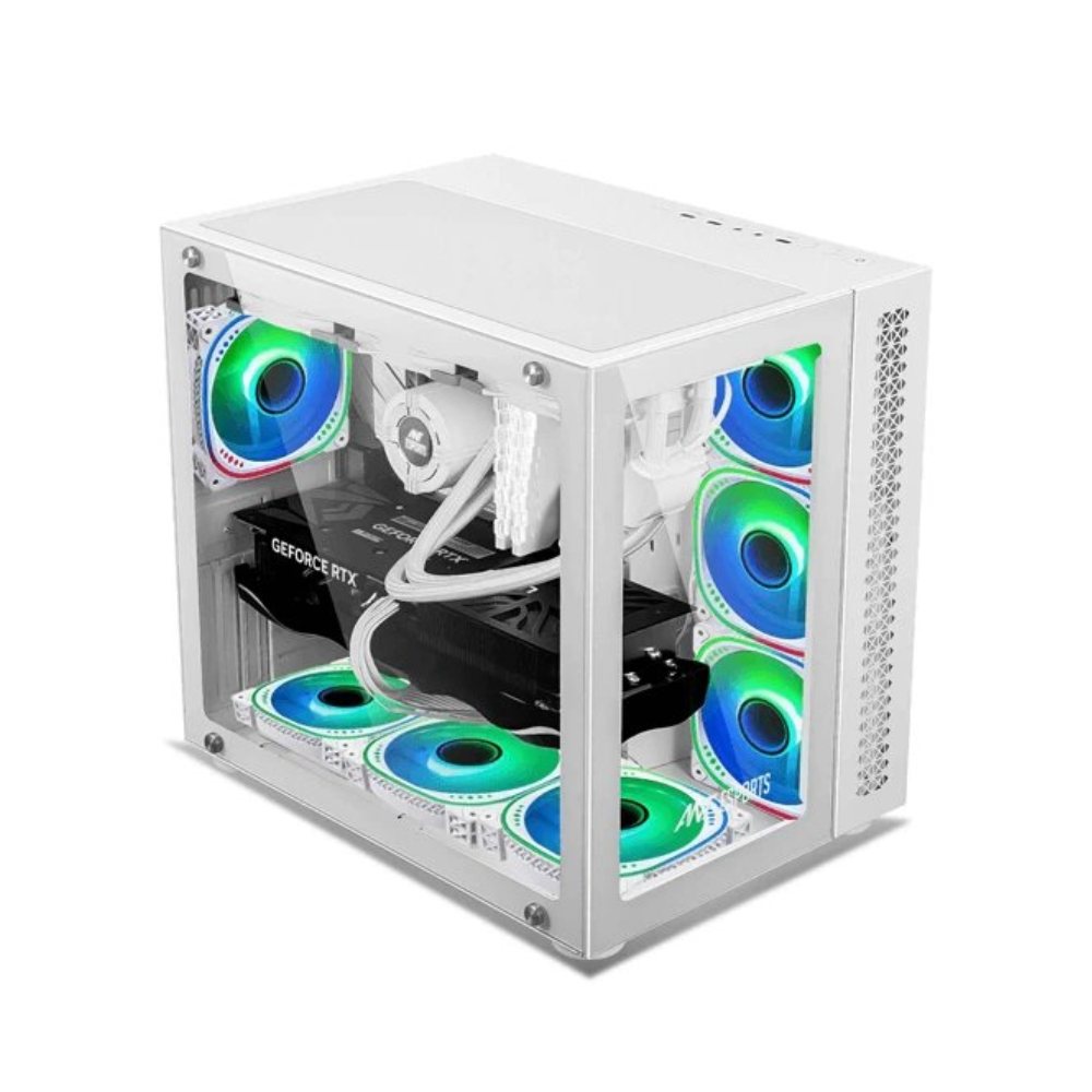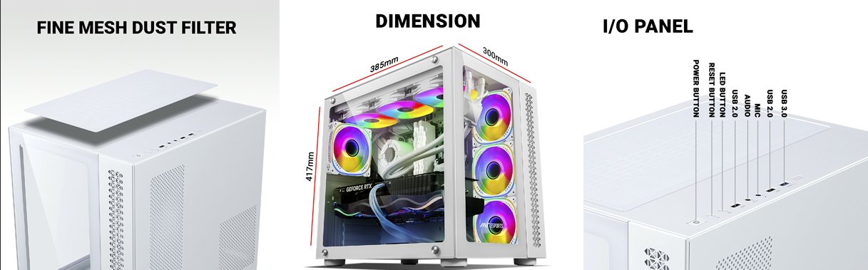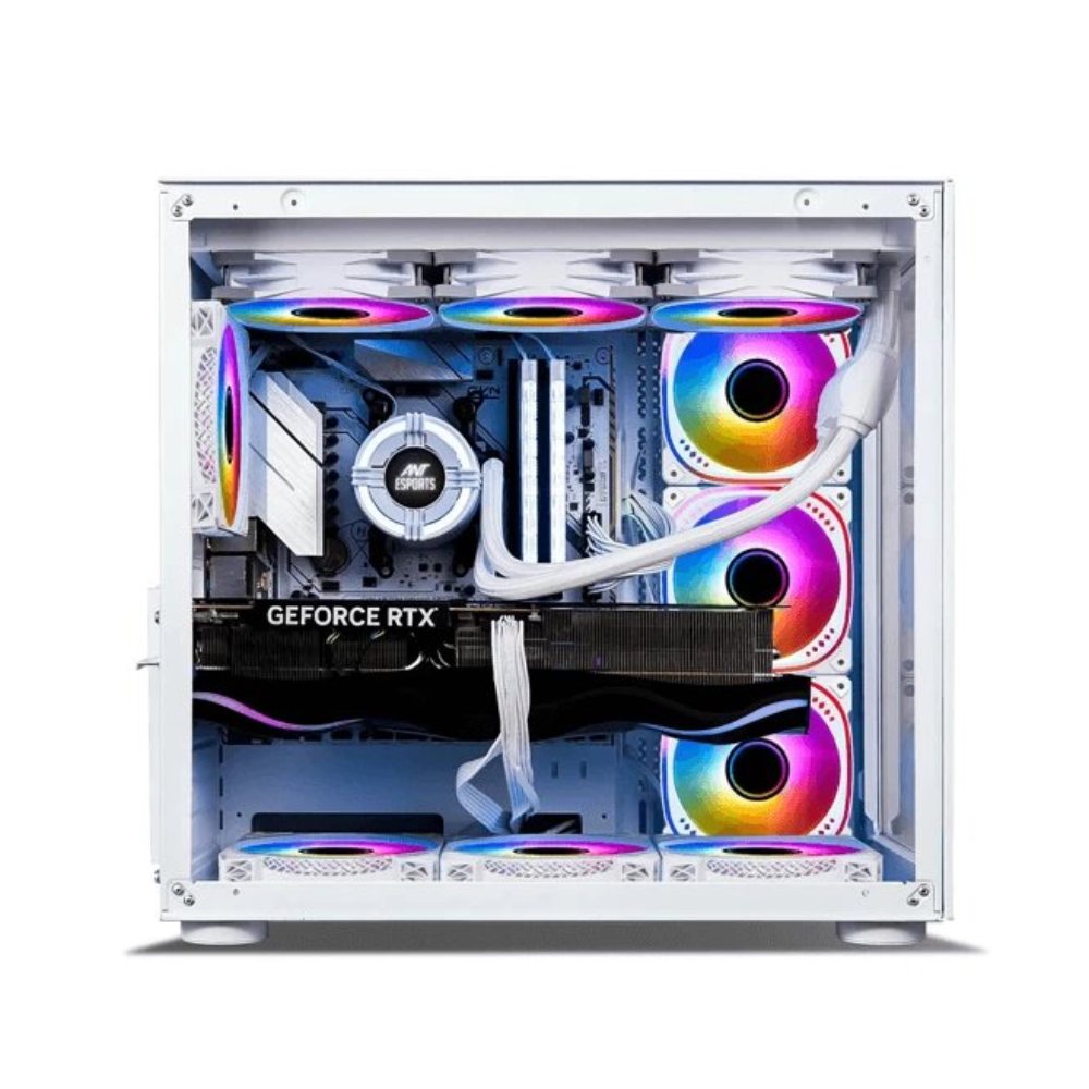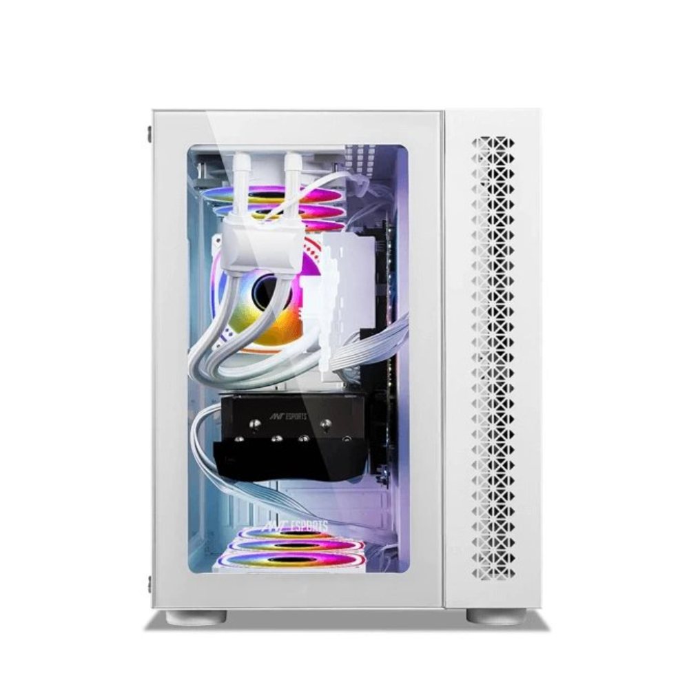 The Ant Esports Crystal White is designed to elevate your gaming experience to new heights, a gaming cabinet that combines cutting-edge design with unparalleled performance. With its unique dual-chamber layout and captivating clear glass front and side panels, the Crystal is not just a cabinet – it’s a work of art that showcases your rig’s inner beauty.Designed to accommodate even the most demanding setups, the Ant Esports Crystal offers an expansive interior that can house E-ATX motherboards, allowing you to harness the power of top-tier components. The Crystal’s spacious design provides ample room for high-performance CPU air coolers of up to 168mm in height, ensuring optimal cooling efficiency for your rig.