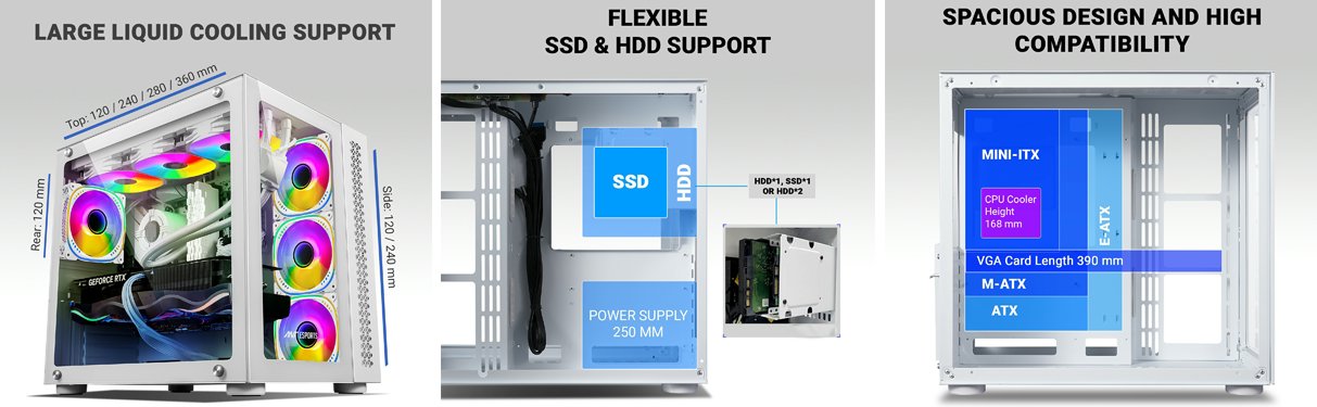 - Extreme Compatibility: Supporting up to E-ATX motherboards, the Crystal cabinet is equipped to handle a wide range of system configurations. Its generous CPU cooler clearance of up to 168mm accommodates even the tallest air coolers, while the top panel can house up to a 360mm radiator for liquid cooling enthusiasts, ensuring optimal cooling performance.