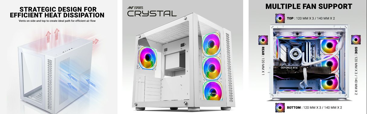 - Ample Cooling Options: Designed with enthusiasts in mind, the Ant Esports Crystal can accommodate up to ten 120mm fans, allowing you to fine-tune your cooling setup for maximum airflow and heat dissipation. This abundance of fan mounts empowers you to maintain ideal temperatures during intense gaming sessions or demanding tasks.