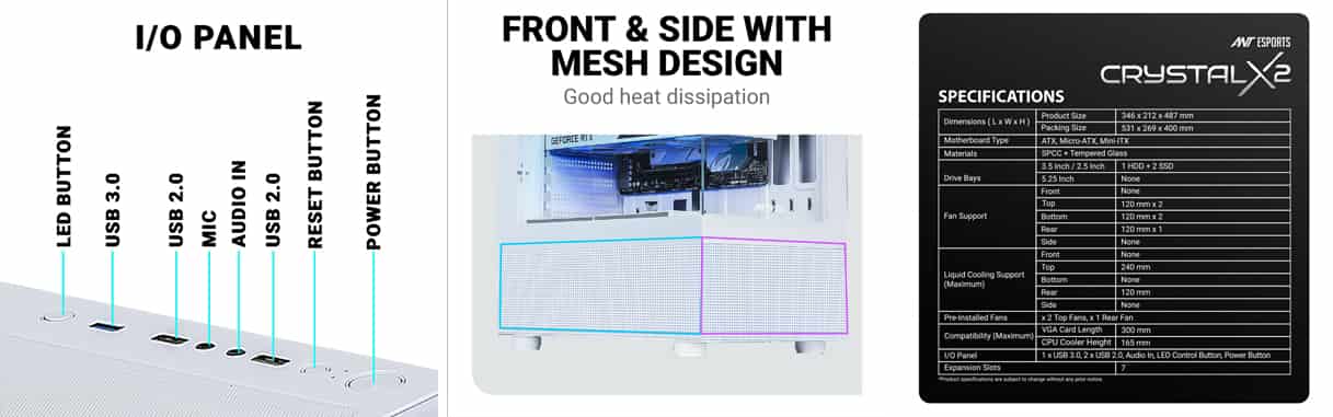 Equipped with three pre-installed 120mm ARGB fans, the Crystal X2 ensures optimal cooling and aesthetics right out of the box, and with support for up to five 120mm fans in total, users can customize their cooling setup for peak performance. The cabinet supports CPU air coolers with a height of up to 165mm, accommodating all mainstream air coolers in the market. It also features versatile storage options, allowing users to house up to one 3.5″ HDD and two 2.5″ SSDs simultaneously. The IO panel includes two USB 2.0 ports, one USB 3.0 port, audio jacks, a power button, and an LED control button, providing convenient connectivity and control.