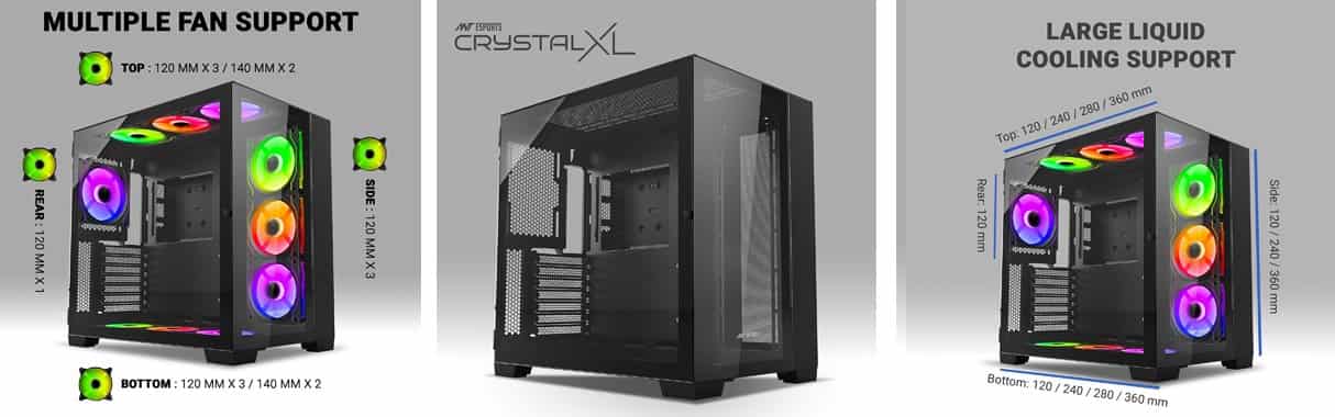 Ant Esports Crystal XL is the ultimate gaming cabinet designed to elevate your gaming experience. With its innovative dual chamber design, this cabinet redefines both style and functionality. Engineered to accommodate up to ATX motherboards and PSUs, the Crystal XL provides the perfect canvas for your gaming dreams. Unleash the power of liquid cooling with support for not just one, but three 360mm radiators, allowing you to push your system’s performance to its limits. Whether you’re aiming for top-tier performance or intricate aesthetics, the Crystal XL has you covered with radiator mounting options on the top, bottom, and side.