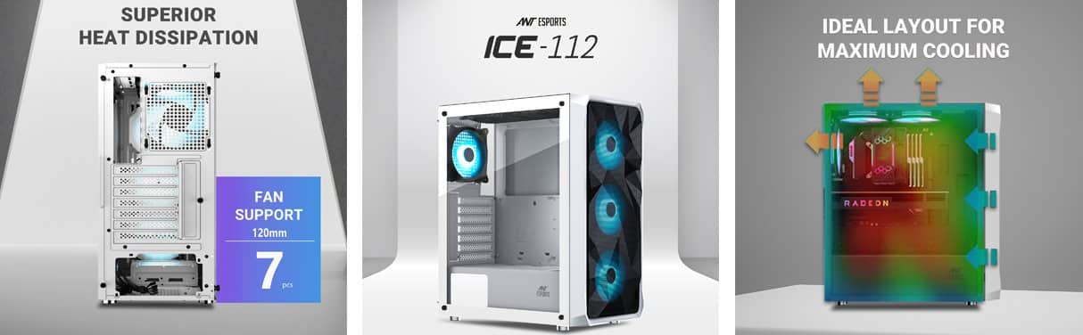 The Ant Esports ICE-112 White Gaming PC Cabinet is the ultimate fusion of style and performance for every avid gamer and PC enthusiast. Designed to elevate your gaming experience, this cabinet boasts an impressive array of features that cater to your customization needs. With support for up to an ATX motherboard, the ICE-112 provides a spacious canvas for your dream gaming rig. The cabinet’s cooling prowess is unmatched, accommodating CPU air coolers of up to 160mm in height, ensuring optimal thermal management during intense gaming sessions. For those seeking advanced cooling solutions, the ICE-112 welcomes liquid cooling setups with open arms, allowing for the installation of up to a 360mm radiator in the front.