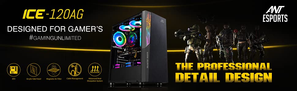 - Ant Esports ICE-120AG is a mid-tower gaming cabinet capable of housing motherboards from the smallest mITX form factor all the way up to the conventional ATX standards.