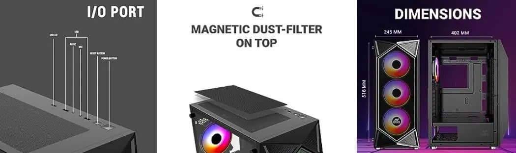- Convenient Front I/O Ports: With two USB 2.0 ports and one USB 3.0 port located on the front panel, this gaming PC cabinet offers convenient access to connect your peripherals and external devices. The USB 3.0 port enables high-speed data transfer, making it easy to transfer files or connect USB 3.0 compatible devices.