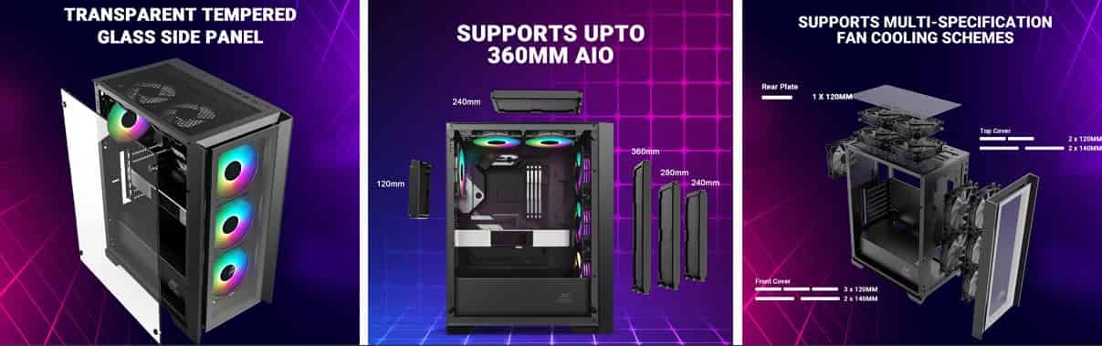 - Efficient Cooling Solution: Equipped with four pre-installed fans, the ICE-170TG ensures optimal airflow throughout the case. This comprehensive cooling setup helps dissipate heat effectively during long gaming sessions, keeping the components running at their peak performance. Additionally, the cabinet supports a 360mm radiator in the front, providing enthusiasts with the option for high-performance liquid cooling solutions.