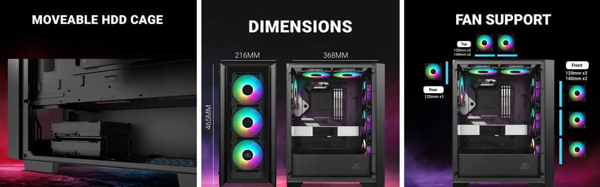 Gone are the days of struggling with limited cooling options. The Ant Esports ICE-170TG comes with support for up to a 360mm radiator in the front, allowing you to unleash the potential of liquid cooling for superior heat dissipation and quieter operation. Alternatively, if you prefer the reliability of air cooling, the cabinet accommodates CPU air coolers up to an impressive height of 175mm, providing you with plenty of choices for keeping your CPU cool under pressure.Storage enthusiasts will also find joy in the Ant Esports ICE-170TG. The cabinet is equipped to house either two SSDs or two HDDs, catering to your storage needs without compromise. But what sets it apart is the moveable HDD cage under the PSU shroud. This innovative feature lets you customize the internal layout to optimize airflow or accommodate different component configurations, ensuring a clean and tidy interior.Crafted to accommodate your evolving gaming rig, the Ant Esports ICE-170TG delivers on both style and substance. Its striking appearance, combined with efficient cooling and storage options, makes it an exceptional choice for avid gamers and PC enthusiasts alike.