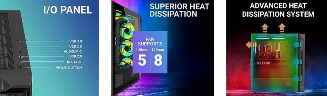 • Ample of Fan Support – Three 120mm A-RGB fans are included with the case, providing ample cooling power while adding a stylish touch to your gaming setup. The case can support upto eight 120mm fans to create the perfect air cooled system.