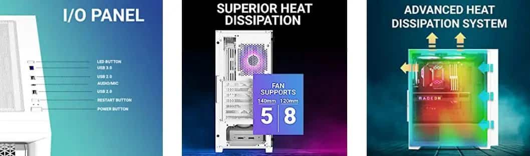 - Rich IO Panel – The case features an IO panel with one USB 3.0 and two USB 2.0 ports, providing convenient connectivity options for your peripherals and accessories.