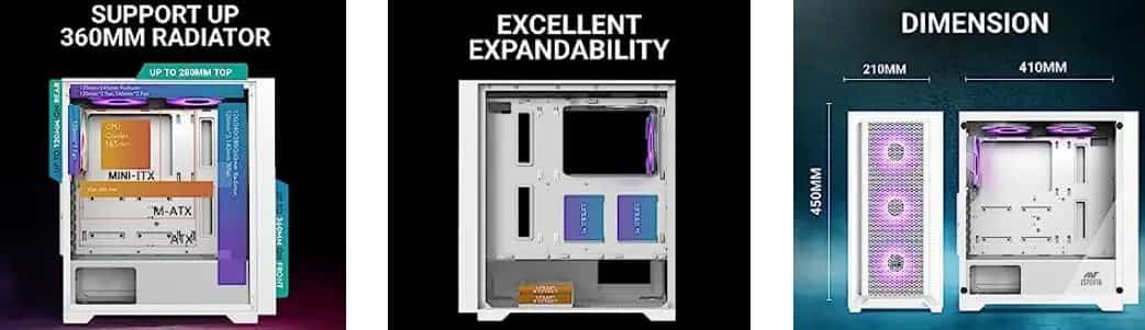 - Ample of Fan Support – Three 120mm ARGB fans are included with the case, providing ample cooling power while adding a stylish touch to your gaming setup. The case can support upto eight 120mm fans to create the perfect air cooled system.