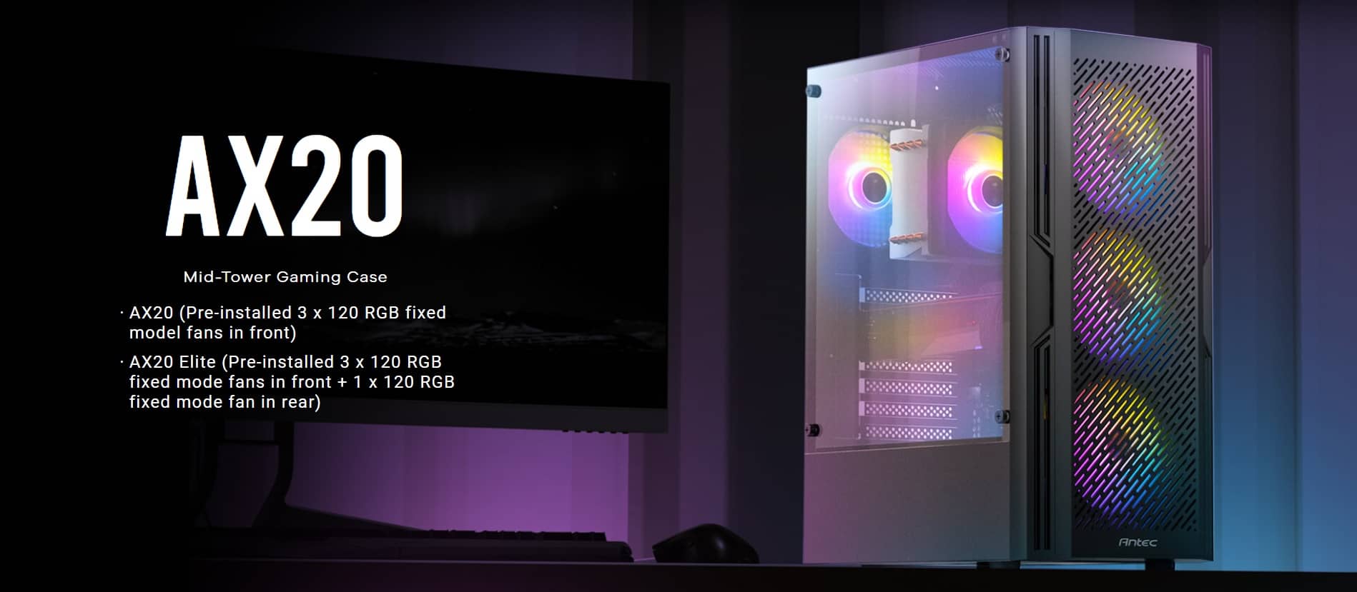 | Included Fan(s) | 3 x 120 RGB fixed model fans in front (AX20) 3 x 120 RGB fixed mode fans in front + 1 x 120 RGB fixed mode fan in rear (AX20 Elite) |