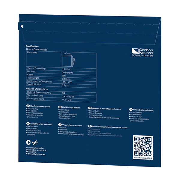 The Arctic APT2012 100x100x0.5mm Thermal Pad provides an efficient thermal interface between heat sinks and electronic devices where uneven surface topography, air gaps and rough surface textures are present. The silicon based material outperforms generic pads by far, is flexible and adaptive and thus works also at low pressure.