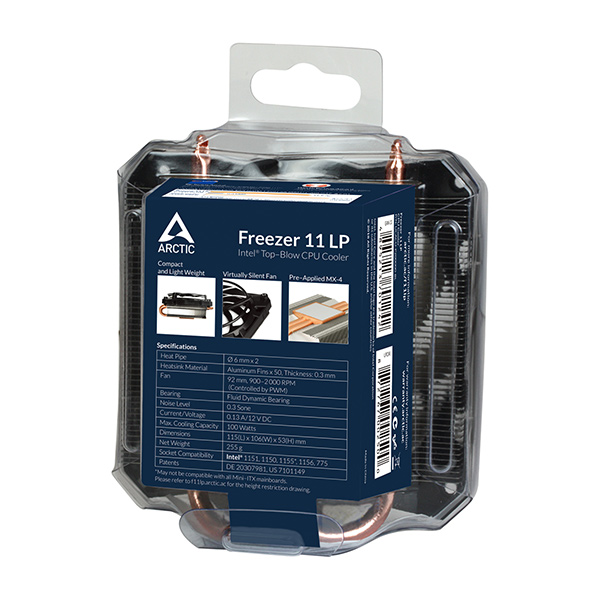 With a height of only 52,5 mm and the capability to draw air in from the side, the Freezer 11 LP is an extremely slim CPU cooler that fits into every HTPC and low profile computer. Its light weight limits the stress on the motherboard to a minimum and makes it absolutely transport safe.