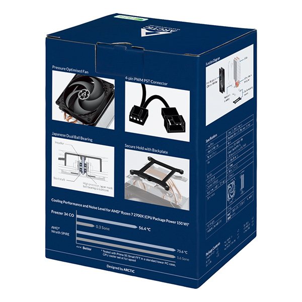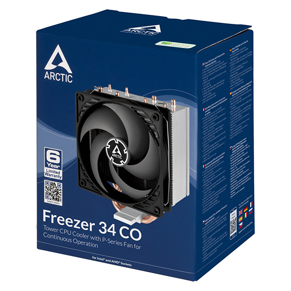 The Arctic Freezer 34 CO is a Tower CPU cooler with a 120 mm P-series fan. It is a powerful cooling solution for AMD & Intel CPU and recommended for CPU with a TDP up to 150 W. The pressure-optimised fan blades create a focused airstream for increased performance. Thanks to its japanese dual ball bearing, the ARCTIC Freezer 34 CO is optimised for continuous operation. With highest-quality bearings and a newly developed motor, the fan is very quiet, efficient and durable