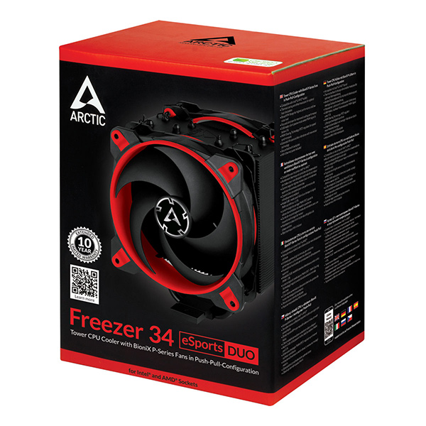 The two BioniX P-fans of the Arctic Freezer 34 eSports DUO Red work in push-pull-configuration The resulting increase of airflow ensures that more cold air is transported into the heatsink for cooling and the heat from the CPU is dissipated even faster from the heat sink. This ensures the best possible performance of the CPU.