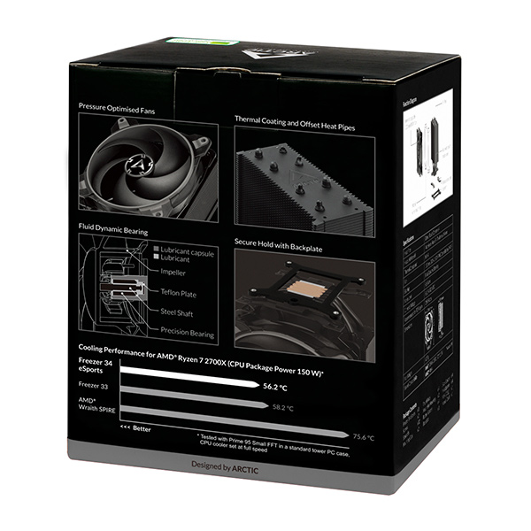 Fast and easy to install and extremely reliable, the Arctic Freezer 34 eSports Grey mounting system is compatible with Intel and AMD sockets. Thanks to a backplate and its low weight, the Freezer 34 eSports is not only foolproof to install, but also absolutely transport safe.