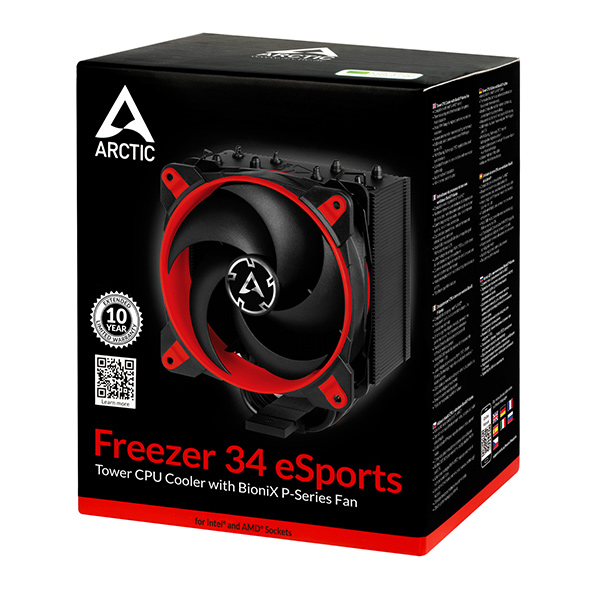 The Arctic Freezer 34 eSports Red is a Tower CPU cooler with a 120 mm BioniX P-fan. It is a powerful cooling solution for ® ® AMD & Intel CPU and recommended for CPU with a TDP up to 200 W. The pressure-optimised fan creates a focused airstream for increased performance. A broad RPM range enables highest performance as well as low noise levels. With high-quality bearings and a new motor-generation, the fan is very quiet, efficient and durable.
