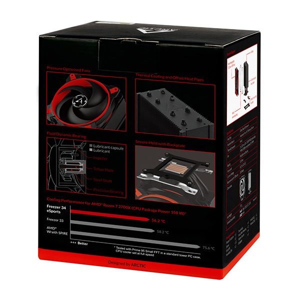 With a powerful, pressure-optimised BioniX P-fan and its updated, thermal-coated heatsink, the Arctic Freezer 34 eSports Red offers a lot of performance for a fair price. In internal tests levelled to 28 dB(A), the Freezer 34 eSports was able to surpass many competitors, even much bigger and more expensive double tower cooling solutions.