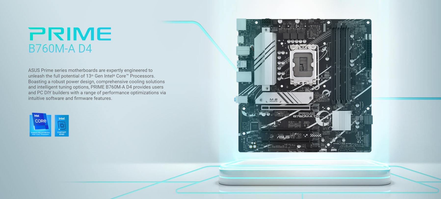 The Asus Prime B760M-A D4 are built to handle the high core counts and bandwidth demands of 13th Gen Intel® Core™ Processors. Asus Prime B760M-A D4 motherboard provides all the fundamentals to boost daily productivity, so your system will be ready for action with stable power, intuitive cooling and flexible data transfer options.