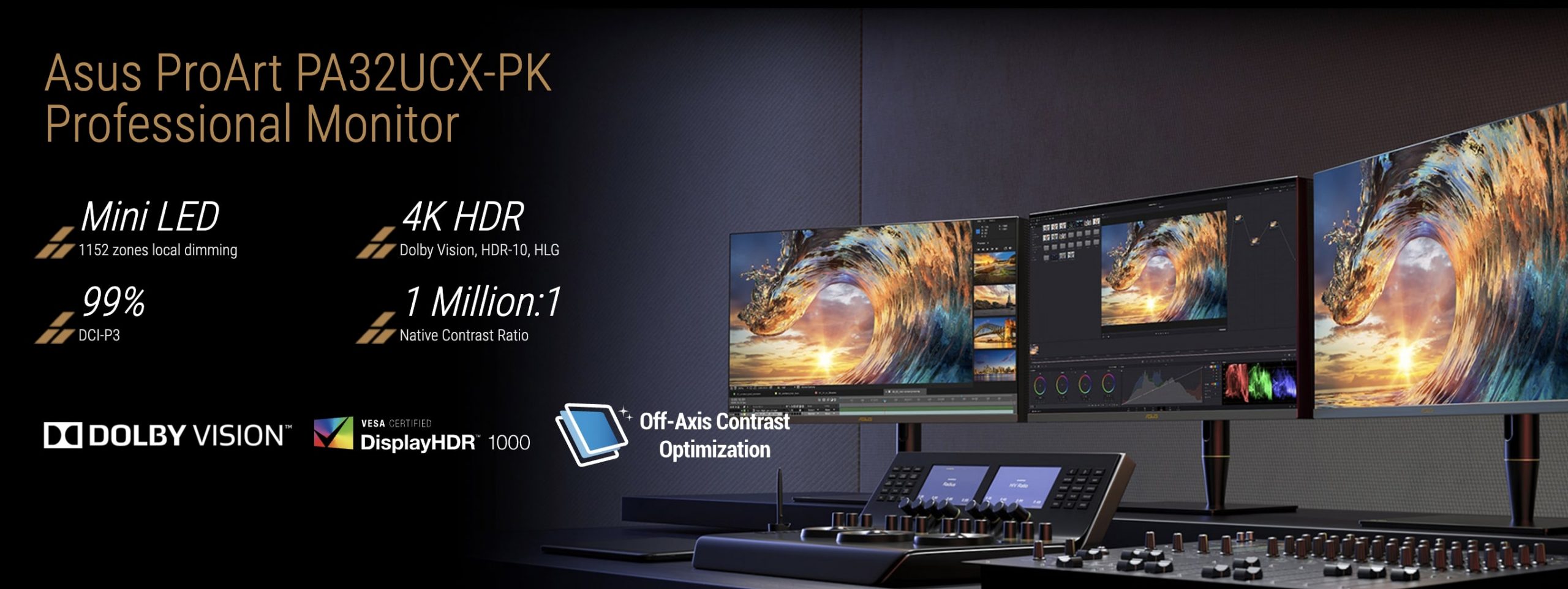 Asus ProArt PA32UCX-PK is a 32-inch 4K HDR monitor designed for discerning content creators, including videographers, cinematographers and colorists. When multiple content creators work together on the same screen, it is necessary that everyone sees the same color and contrast level. With new Off-Axis Contrast Optimization (OCO) technology that reduces halo effects when viewing the screen from a wide angle, Asus ProArt PA32UCX-PK features ensures on-screen content is displayed accurately to all viewers. Asus ProArt PA32UCX-PK features a peak brightness of 1,200 nits and mini-LED backlighting, enabling 1,152 zones of local dimming control and support for multiple HDR formats, including Dolby Vision™, HLG and HDR-10. With true 10-bit color and quantum dot technology, support for the DCI-P3, Rec. 709, Rec. 2020 and Adobe RGB color spaces, together with a rich selection of connectivity, Asus ProArt PA32UCX-PK delivers an exceptional image that takes the viewing experience to the next level.