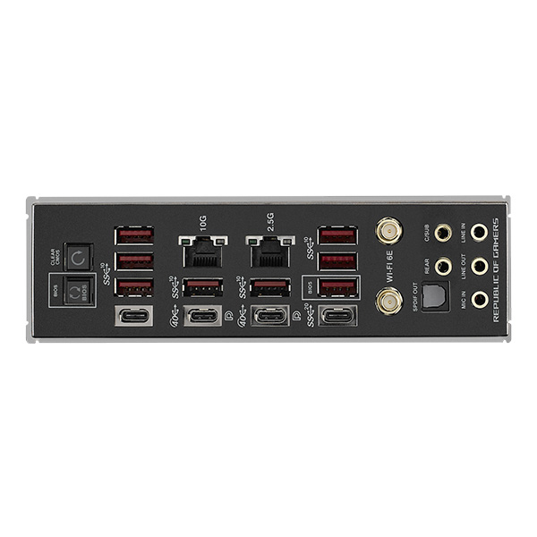 | Back Panel I/O Ports | 2 x USB4® with Intel® JHL8540 USB4® controller ports (2 x USB Type-C®) 1 x USB 3.2 Gen 2×2 port (1 x USB Type-C®) 9 x USB 3.2 Gen 2 ports (8 x Type-A + 1 x USB Type-C®) 1 x Wi-Fi Module 1 x Intel® 2.5Gb Ethernet port 1 x Marvell® AQtion 10Gb Ethernet port 5 x LED-illuminated audio jacks* 1 x Optical S/PDIF out port 1 x BIOS FlashBack™ button 1 x Clear CMOS button*The rear panel Lime (Line out) port does not support spatial audio. If you wish to use spatial audio make sure to connect your audio output device to the audio jack on the front panel of your chassis. |