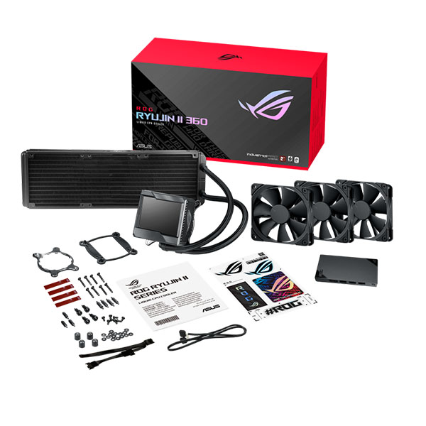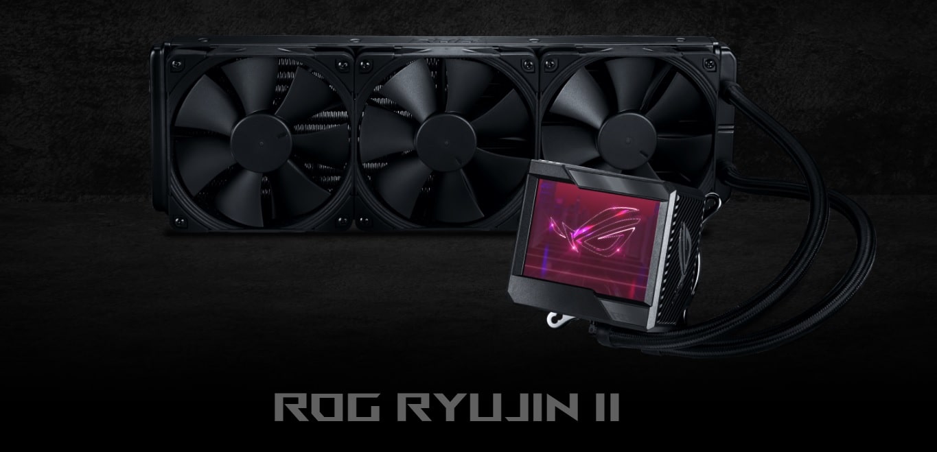 Asus ROG Ryujin II 360 CPU Liquid Cooler The flagship ROG Ryujin II all-in-one cooler delivers ultimate thermal performance for gamers looking for the absolute best. With a 7th Generation Asetek pump, Noctua Industrial PPC radiator fans, and an embedded fan for the CPU socket area, it harnesses both water and air to provide incredible cooling capabilities. And with an LCD panel that displays system stats and customizable graphics, ROG Ryujin II become the heart of your system.