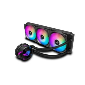 ROG Strix LC 240 RGB all-in-one liquid CPU cooler with Aura Sync, and triple ROG 120mm addressable RGB radiator fans