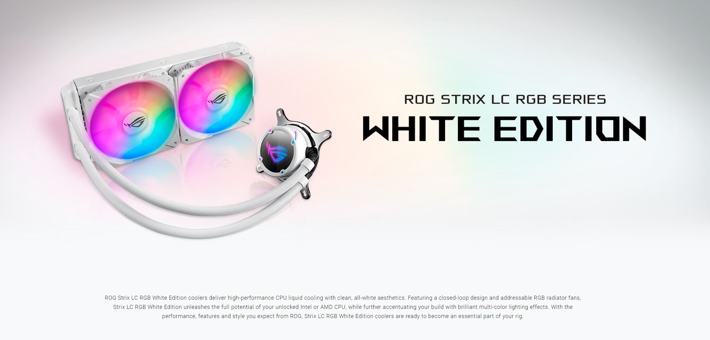 - ROG Strix LC 240 RGB white edition liquid cooler with quieter performance, and customizable color LED and Aura RGB lighting for personalization.