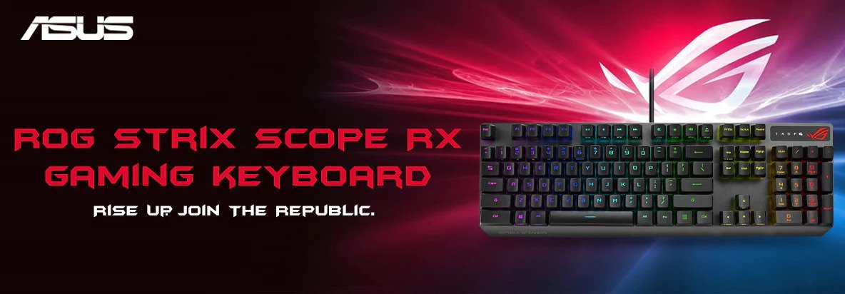 Asus ROG Strix Scope RX Red Optical Switches Take on all comers with ROG Strix Scope RX, the first mechanical RGB gaming keyboard featuring exclusive ROG RX Red Optical Mechanical Switches. These switches provide a 100-million-keystroke lifespan and offer consistent linear keystrokes with immediate response. In addition, each switch has a central RGB LED to give every key all-round lighting. Strix Scope RX also offers IP57 waterproof and dust resistance, an alloy top cover, and USB 2.0 passthrough. Like all Strix Scope series gaming keyboards, it has a wider Ctrl key and a Stealth key for FPS gamers. Go confidently into battle with ROG Strix Scope RX. Asus ROG Strix Scope RX Red Optical Switches