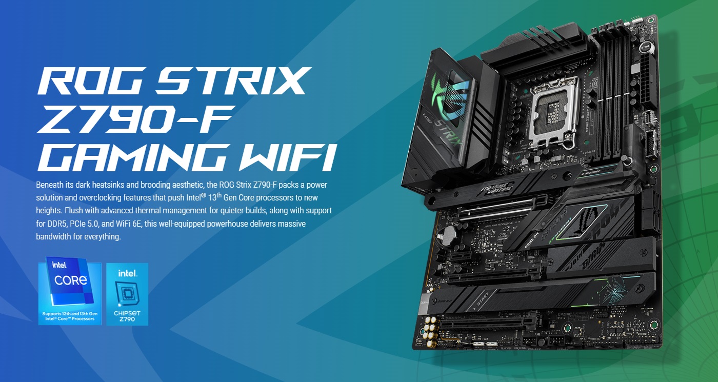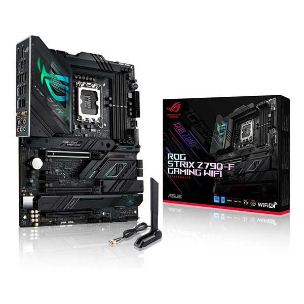 Intel® Z790 LGA 1700 ATX motherboard with 16 + 1 power stages, DDR5 memory support, four M.2 slots, PCIe 5.0 x16 SafeSlot with Q-Release, WiFi 6E, USB 3.2 Gen 2×2 Type-C® rear I/O port and additional front-panel connector with PD 3.0 up to 30W, AI Overclocking, AI Cooling II, and Aura Sync RGB lighting