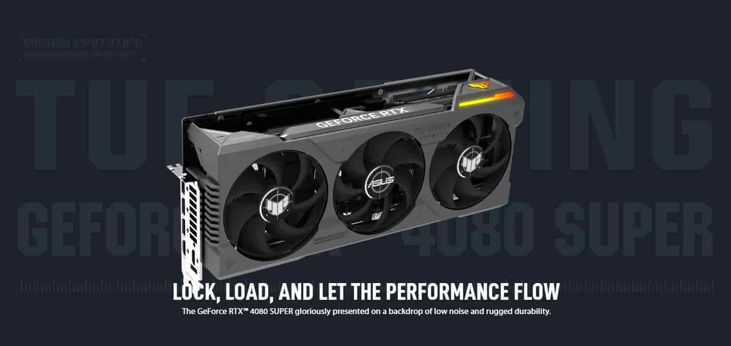 The Asus TUF Gaming RTX 4080 Super 16GB Graphics Card gloriously presented on a backdrop of low noise and rugged durability.