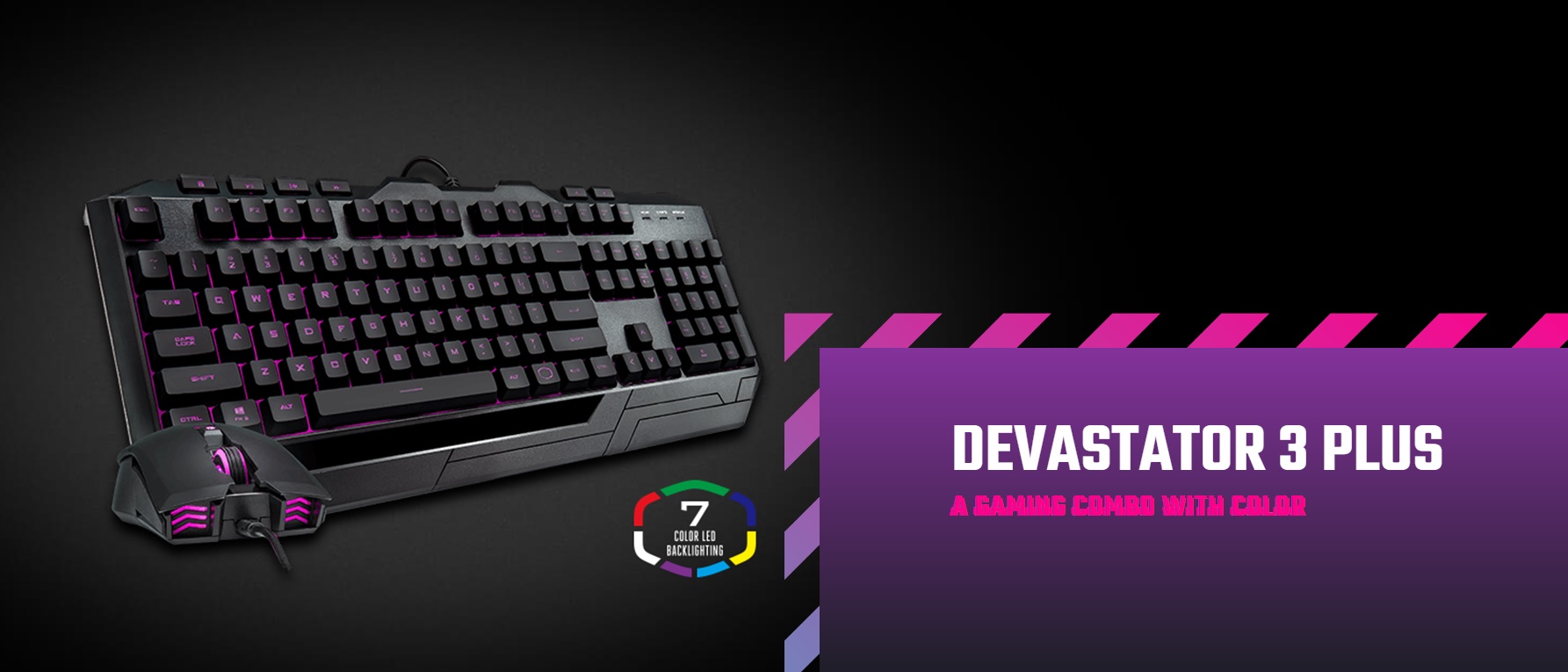 The Cooler Master Devastator 3 Plus RGB Combo is the next generation of our popular gaming keyboard and mouse set. The ergonomic ultra-flat mouse features an adjustable DPI up to 2400 and high-precision mouse wheel, while the low-profile keyboard comes with laser-etched, grip coated keys and Mem-chanical Switches for improved tactile feedback. And now with 7 different LED options, you can customize your peripherals to match all of your hardware in style.