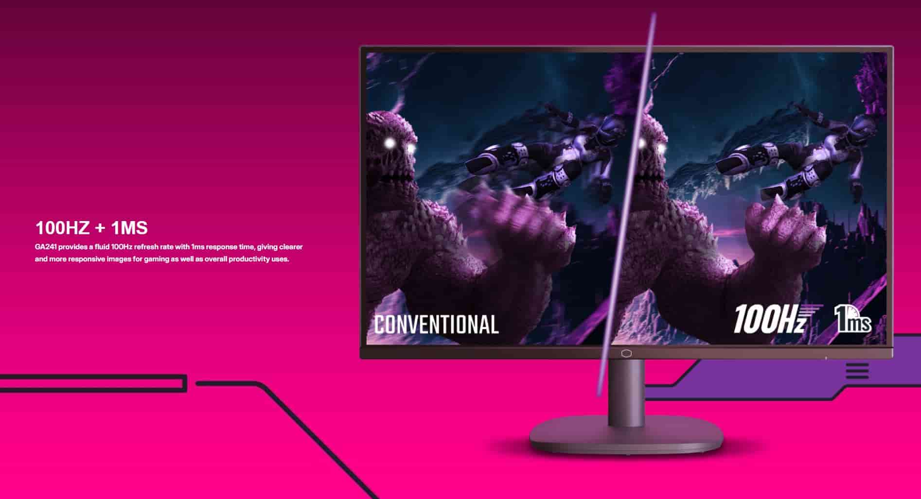 Cooler Master GA241 24 Inch provides a fluid 100Hz refresh rate with 1ms response time, giving clearer and more responsive images for gaming as well as overall productivity uses.
