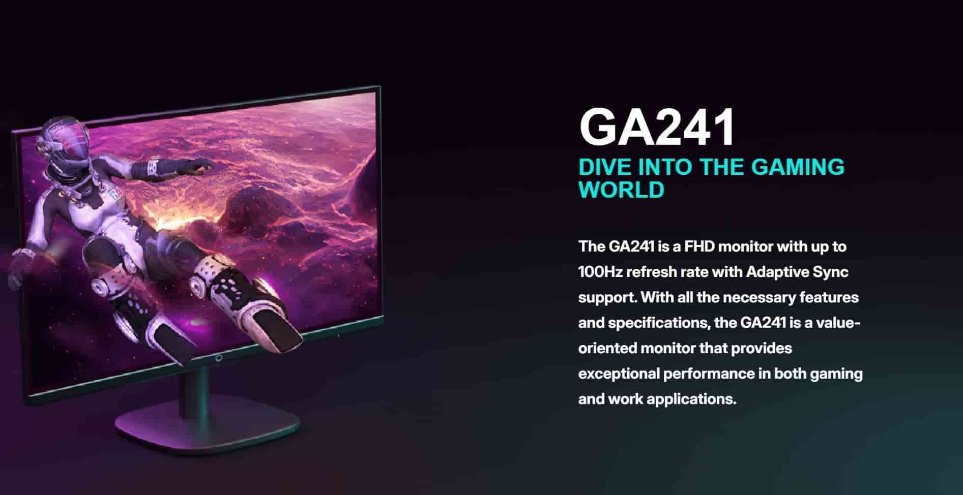 GA241’s VA panel produces deeper, darker blacks for an enhanced contrast level, leading to higher picture quality. With a 4000:1 contrast ratio, GA241’s VA panel is capable of reproducing a contrast level 4x higher than that of a standard IPS panel.