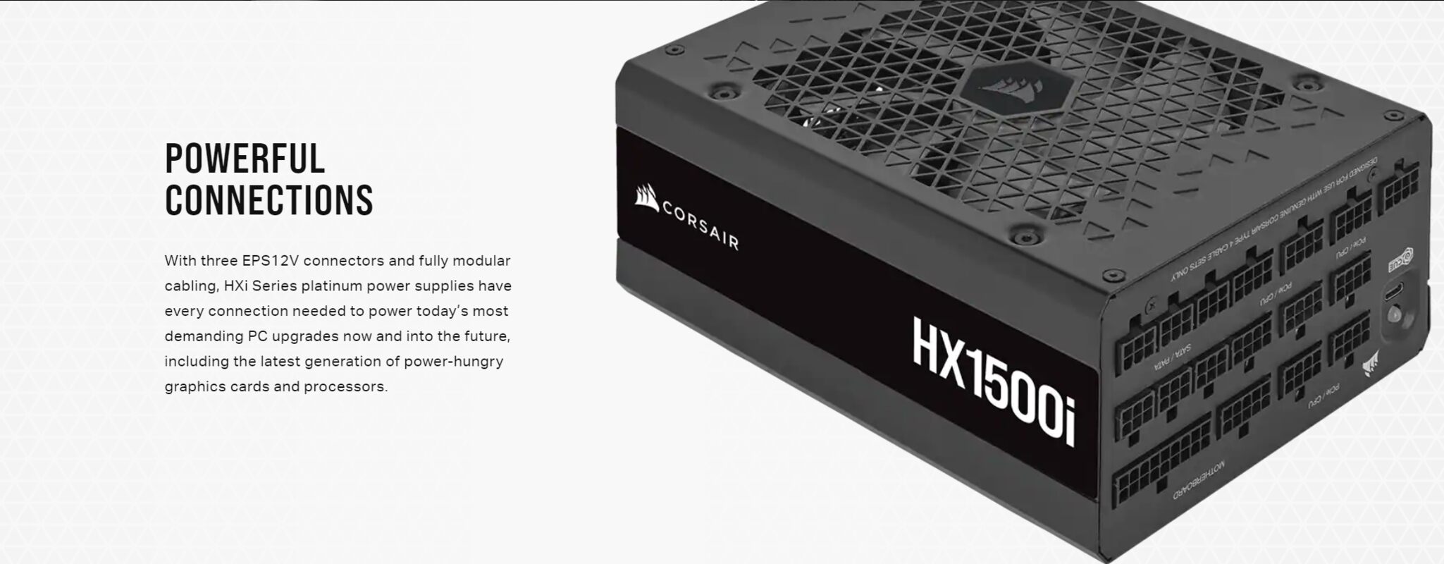 With three EPS12V connectors and fully modular cabling, Corsair HX1500i 80 Plus Platinum Series platinum power supplies have every connection needed to power today’s most demanding PC upgrades now and into the future, including the latest generation of power-hungry graphics cards and processors.