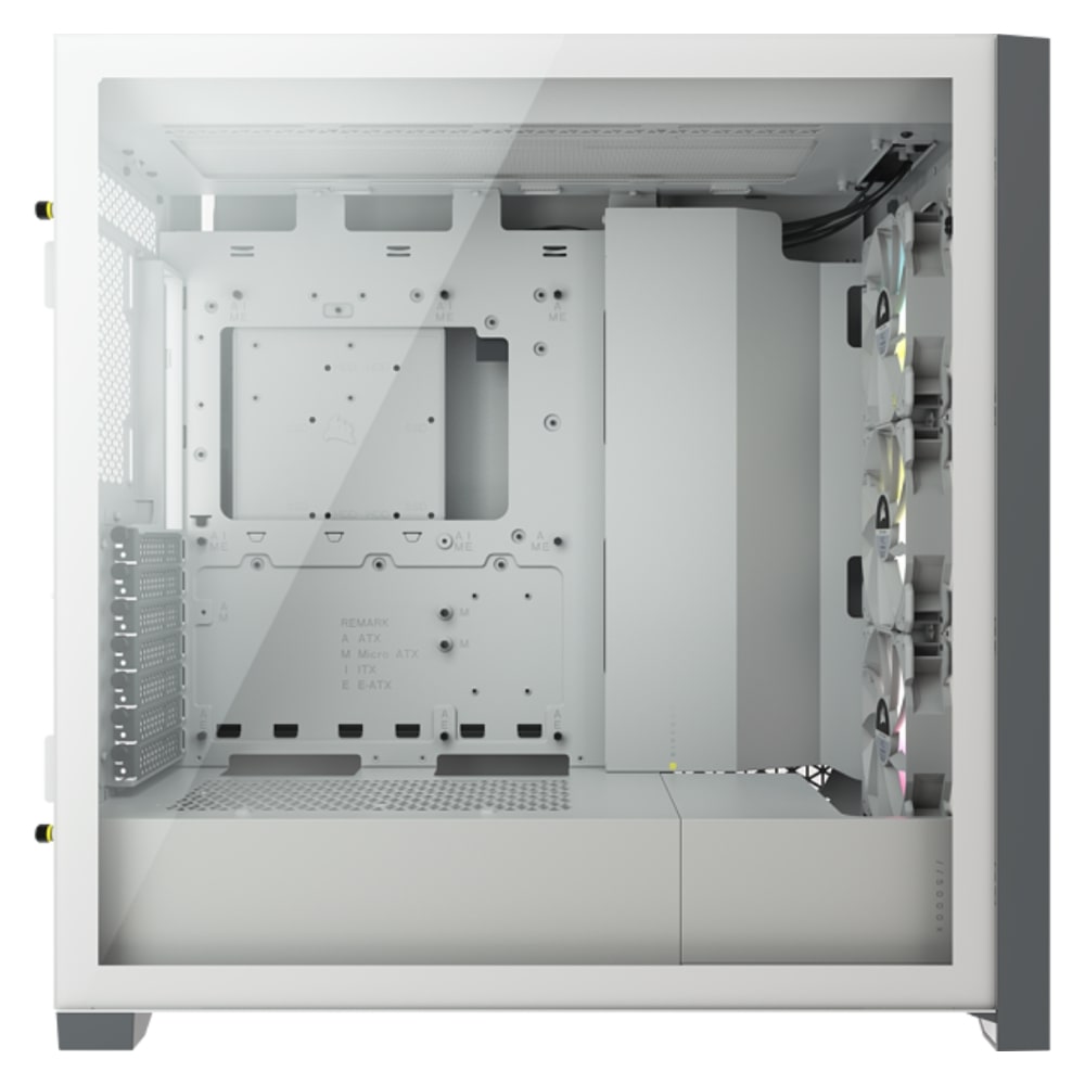 The Corsair iCUE 5000X RGB White makes a stunning, showpiece-worthy PC easy to build and easier to keep cool with the space and flexibility to mount multiple 360mm radiators, all surrounded by beautiful tempered glass on four sides, The CORSAIR iCUE 5000X RGB is a mid-tower ATX case that shows off your PC, and not its cables.