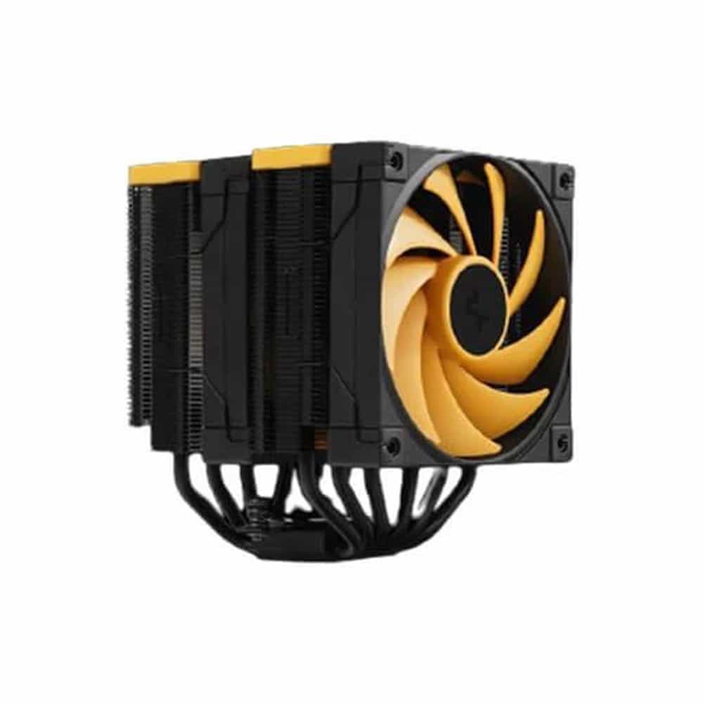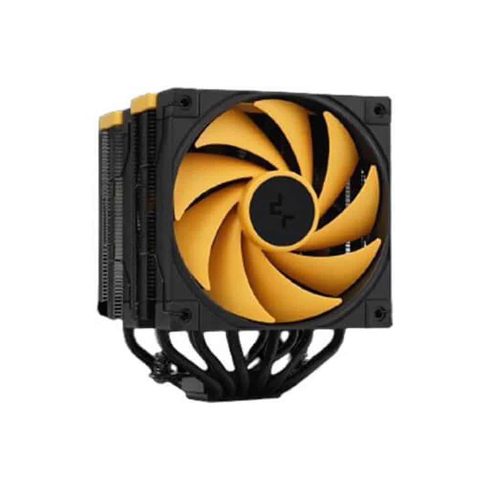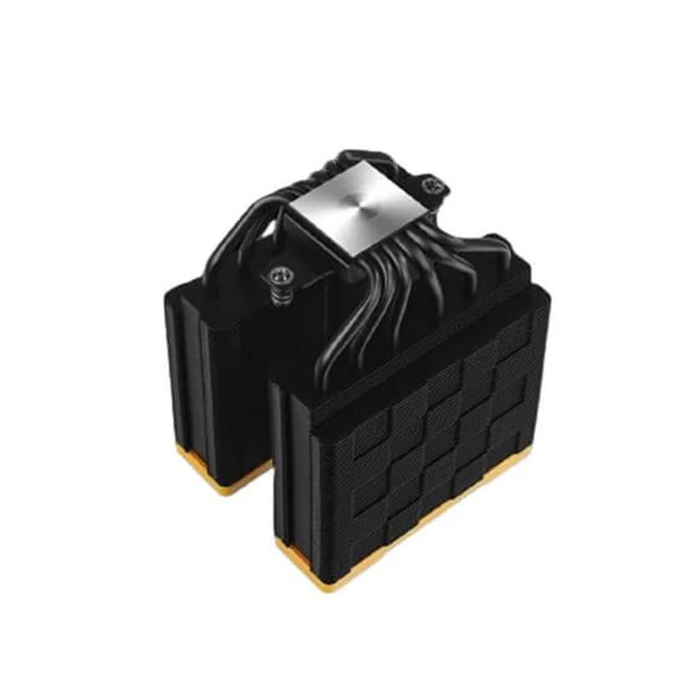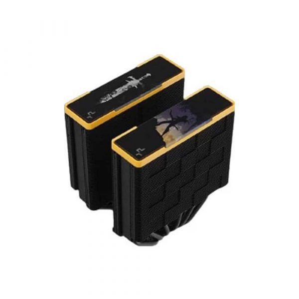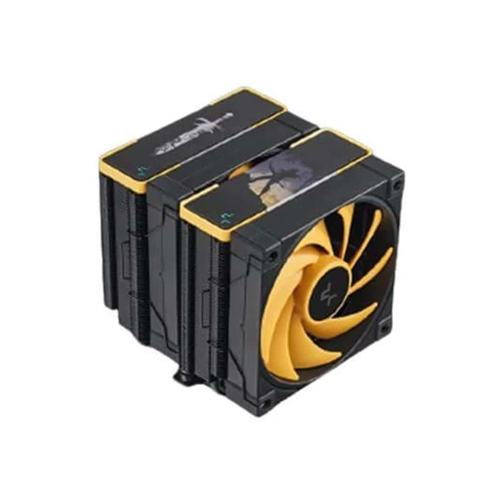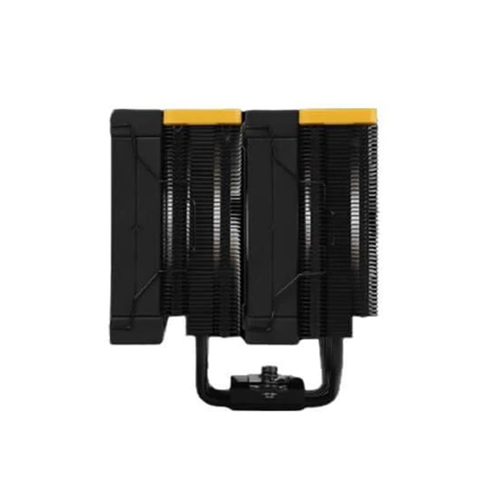 The same premium-quality materials, featuring six advanced copper heat pipes, a pure copper coldplate, a dense dual-tower heat sink, and two silent FDB fans, produce a powerful winning formula for high-performance cooling in a raven black and yellow aesthetic.