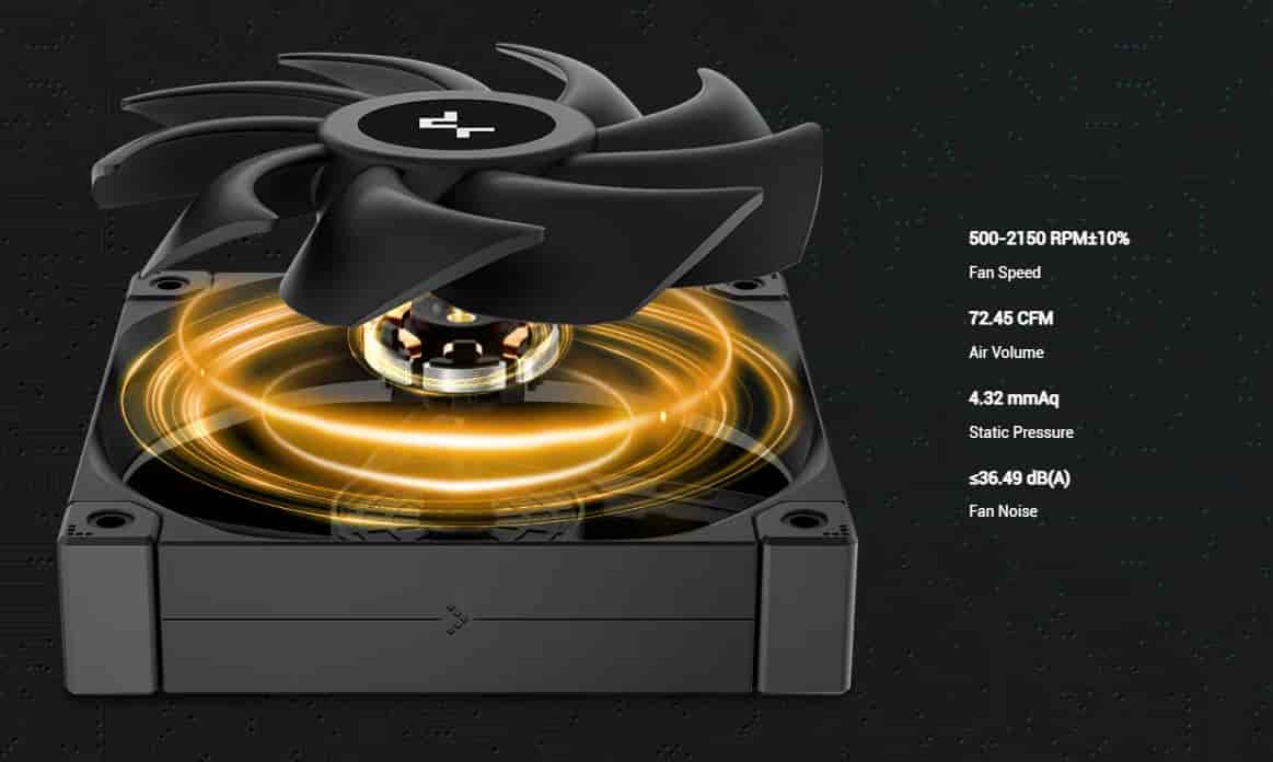 The Deepcool Mystique 360mm CPU Liquid Cooler will include three high-performing black FT12 SE PWM fans. These fans are made of durable PBT material and provide excellent pressure and airflow. They also utilize the tried-and-true FDB bearings that are considered the gold standard in our industry. The fan motor will utilize a 3-phase 6-slot 4-pole design that will provide smoother operation than the average case fan.
