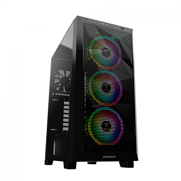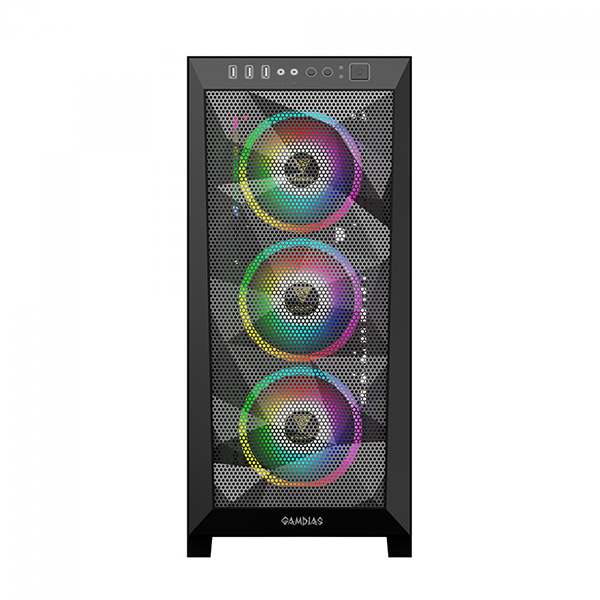 Gamdias ATHENA M1 ELITE A mid-tower case with an asymmetrical mesh design is the signature of a Gamdias ATHENA pc case, the M1 ELITE also features 3 built-in trio-rings ARGB fans, ARGB rimmed I/O port and a spacious design to fit all standard motherboards.