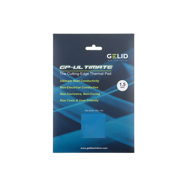 The Gelid GP-Ultimate 120×120 Single 1.5mm is designed to provide perfect thermal interface to transfer heat to heatsinks when installed on PCB with height differences and uneven surfaces such as DRAM ICs, VRM ICs, power MOSFETs, NVRAM ICs and other high-temperature SMD components. Thanks to its enhanced multilayer matrix, superior material composition, and the ultimate 15W/mK thermal conductivity, the GP-Ultimate 120×120 offers the best performance in class.