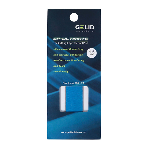 The Gelid GP-Ultimate 120×20 Single 1.5mm is designed to provide perfect thermal interface to transfer heat to heatsinks when installed on PCB with height differences and uneven surfaces such as DRAM ICs, VRM ICs, power MOSFETs, NVRAM ICs and other high-temperature SMD components. Thanks to its enhanced multilayer matrix, superior material composition, and the ultimate 15W/mK thermal conductivity, the GP-Ultimate 120×20 offers the best performance in class.