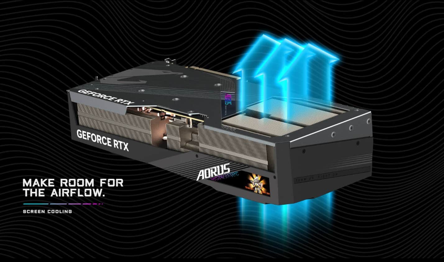 To create more space for airflow to pass through, the heatsink extends over the PCB and therefore increase the ventilation. This Screen Cooling design provides better heat dissipation in Gigabyte Aorus RTX 4080 Super Master.