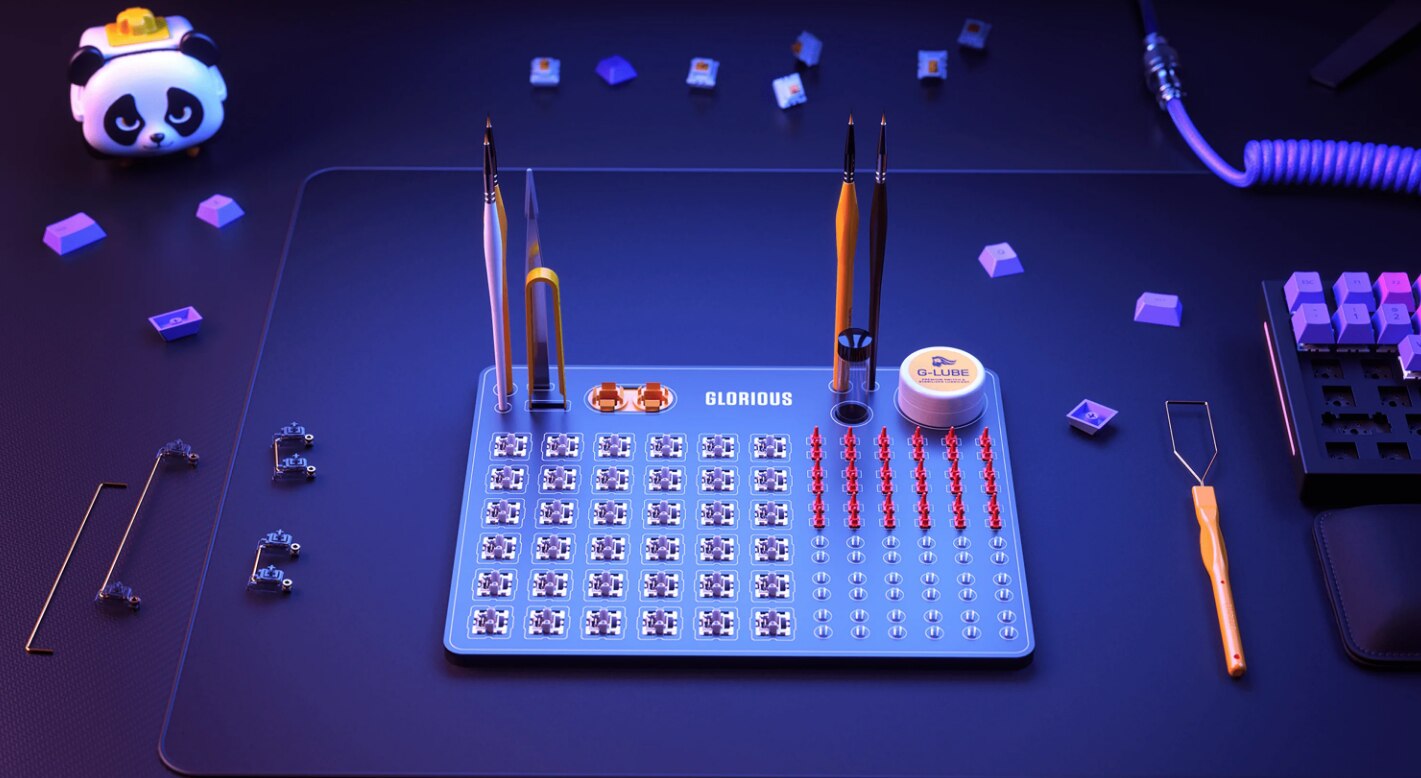 Optimize your switch lubing process with this convenient Lube Kit. Its seven equipment slots keep your Glorious modding tools clean and organized. Two lube holders provide hands-free access to prevent slippery fingers. Prepare up to 36 disassembly switches at once for quick and efficient lube application with Glorious Lube Station