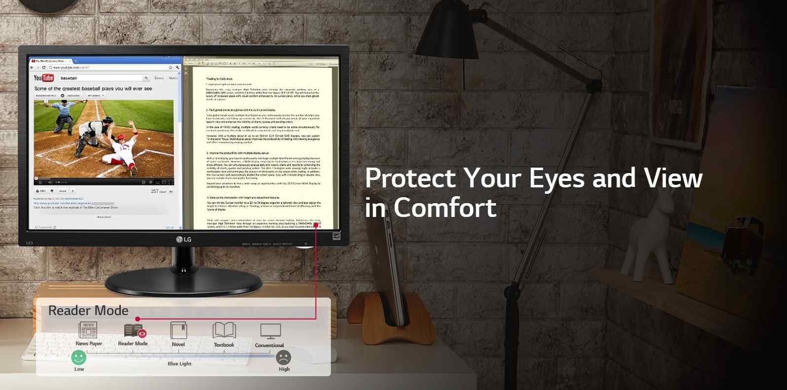 Flicker Safe and Reader Mode help maximize visual comfort by protecting your eyes from harmful blue light and reducing the flicker level to almost zero.