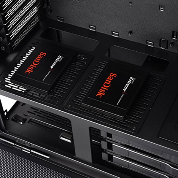 | Drive | Behind MB Tray: 2 x 2.5″ SSD Behind the right flip panel: 2 x 2.5”SSD Hard Drive Cage: 3 x 3.5″ HDD/2.5″ SSD Above PSU Chamber: 2 x 2.5″ SSD |