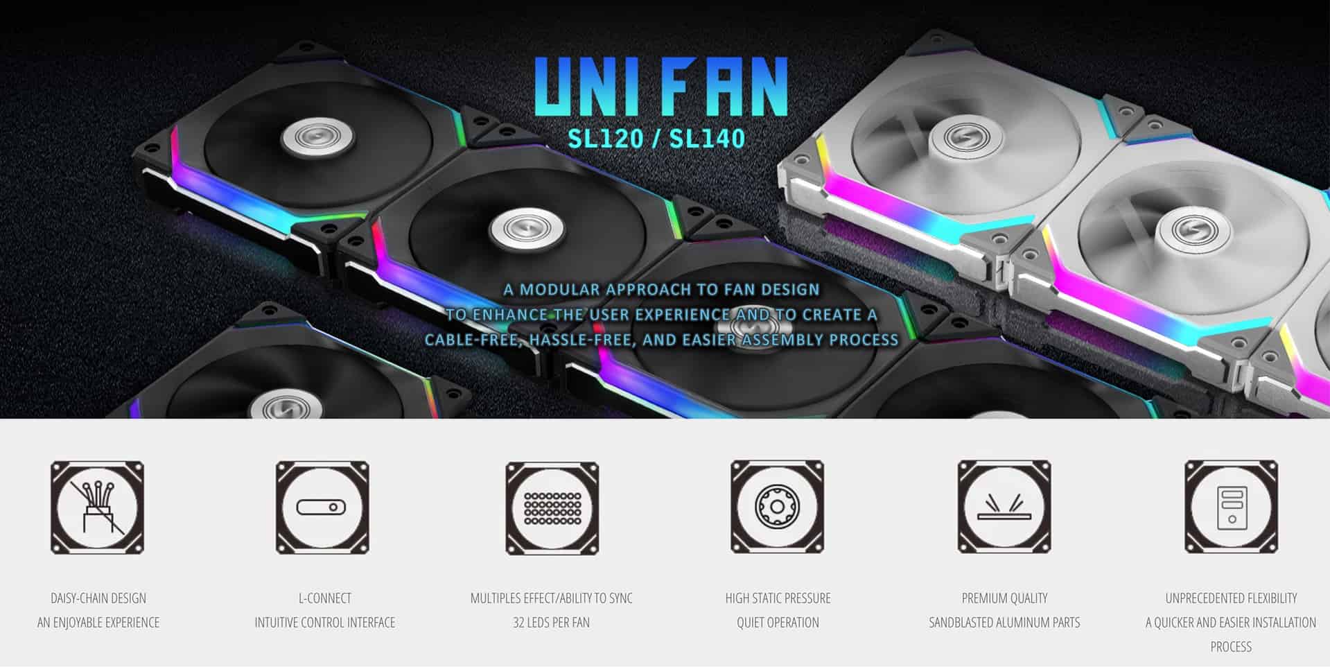 Revolutionary Lian Li Uni Fan SL140 White with modular design, interlocking fan that can be linked up and operate with a fan and RGB cable.